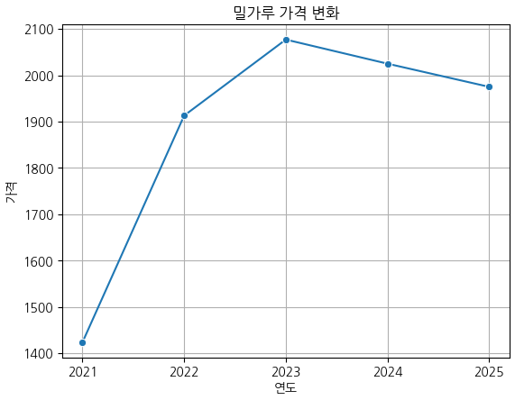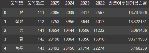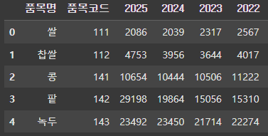 데이터를 살펴보던 중 쌀과 같이 거래가 활발한 상품은 가격정보의 결측값이 없었으나, 쑥갓과 같은 상품들의 가격정보에는 결측값이 존재했다. 그래서 'yearavg' 즉 해당 연도의 평균가격 데이터를 사용했다. 그렇게 전쟁발발 이후인 2022년부터 현재까지의 농수산물 연도별 평균 가격데이터를 확보했다.
