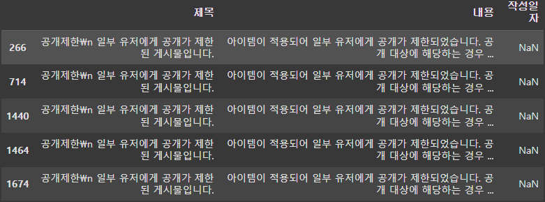 비밀글 같이 공개가 제한된 게시글이 존재했다. 이 글들은 결측치라 판단해 데이터에서 제거했다.