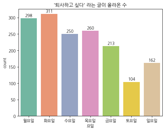 plt.title('\'퇴사하고 싶다\' 라는 글이 올라온 수')