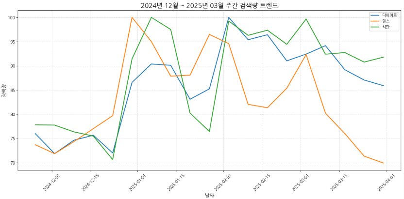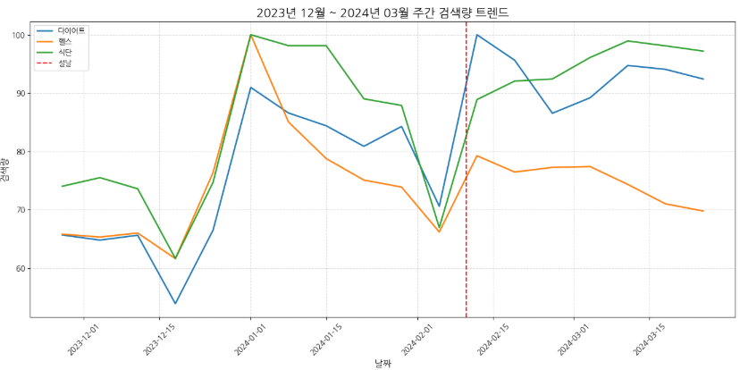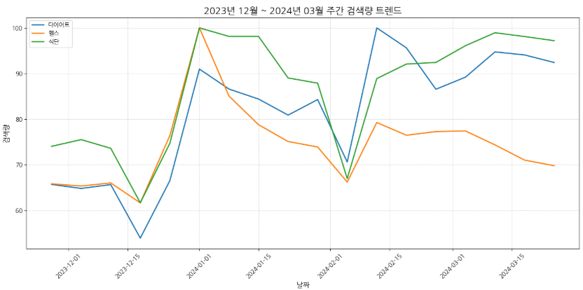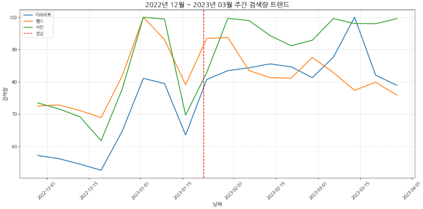 수집한 데이터를 시각화 해봤다. X축은 날짜, Y축은 단어별 검색량 추이를 나타낸다. 그래프를 보면 새해(신년)를 기준으로 다이어트, 헬스, 식단 관련 검색량이 급증하는 것을 확인할 수 있다. 나만 새해에 다이어트를 다짐하는 것이 아니었다!