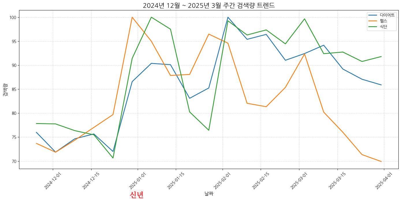 plt.title('2024년 12월 ~ 2025년 3월 주간 검색량 트렌드', fontsize=16)