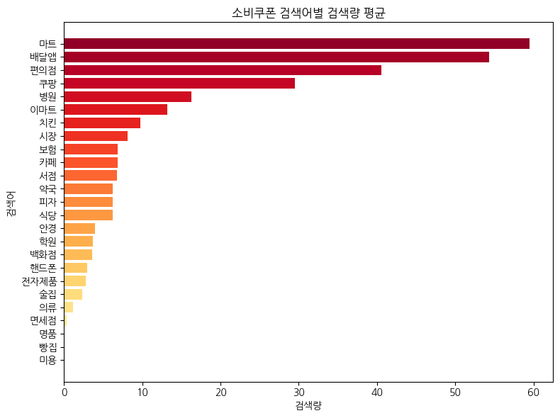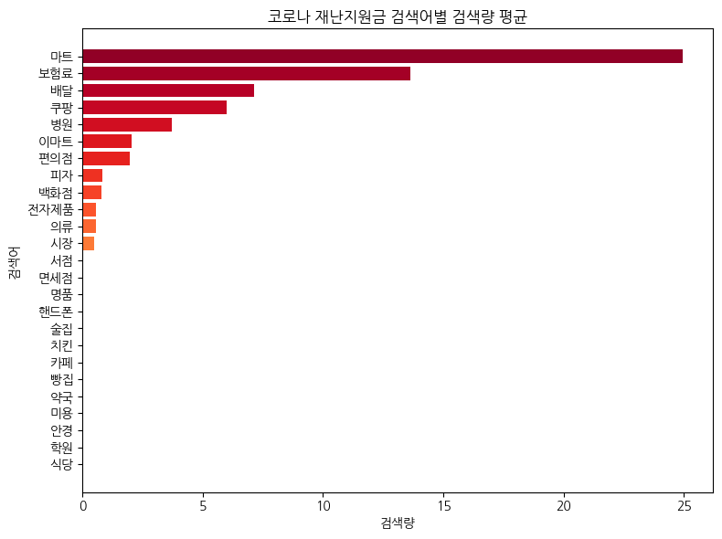 수집한 데이터의 컬럼별 평균을 이용해 아래와 같은 그래프를 그렸다. X축은 검색량 평균, Y축은 검색어를 나타낸다.