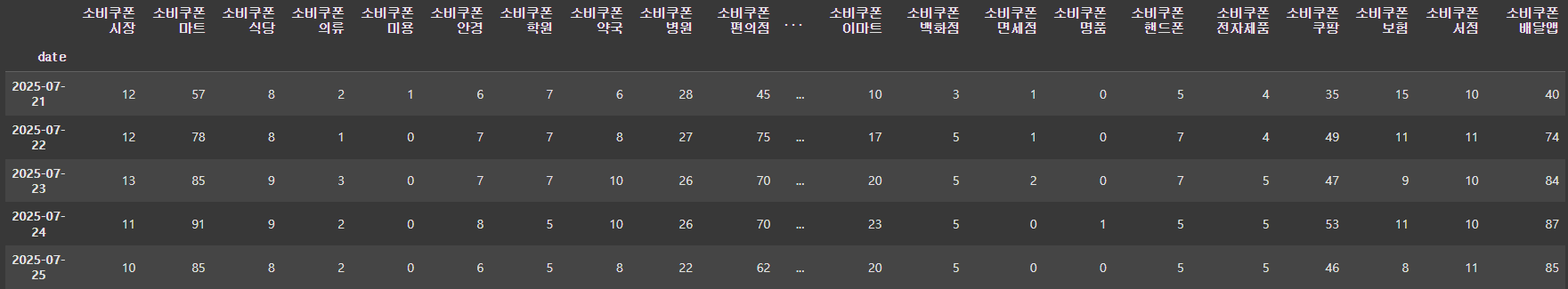마지막으로 시각화 했을 때 컬럼명을 편하게 보기 위해서 컬럼들 앞에 붙은 "소비쿠폰"이라는 단어는 제거해줬다. 그렇게 최종적으로 아래와 같은 데이터프레임을 만들었다.