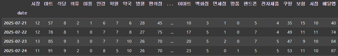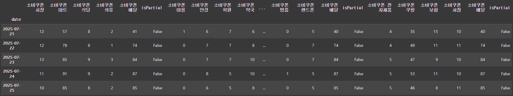 여러 검색어들 중 가장 많은 검색량을 가진 단어는 "배달"이었는데, 처음에는 [배달, 시장, 마트, 식당, 의류] 검색어들 간의 검색량을 수집하고, 다음 루프에서는 [배달, 미용, 안경, 학원, 약국] 검색어들 간의 검색량을 수집해 나가는 방식으로 진행한 것이다. 그렇게 아래와 같은 데이터를 수집할 수 있었다. 날짜는 소비쿠폰 신청을 받기 시작한 7월 21일 부터 8월 1일 까지 수집했다.