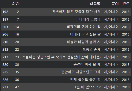 반면에 2016년도 시/에세이의 베스트셀러 도서들을 확인해보면, 아래와 같이 책 제목만 읽어도 힐링되는 느낌이 든다.