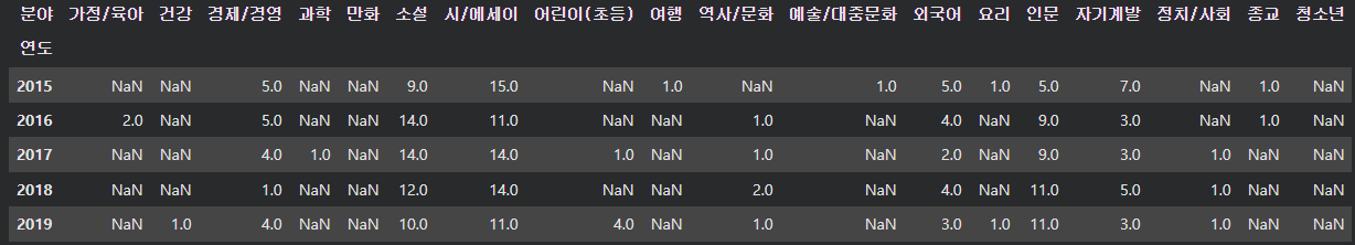 마지막으로 시각화를 편하게 하기 위해 pivot 테이블을 만들었다. 도서 분야의 종류만해도 총 13가지이기 때문에, pivot 테이블을 활용하면 더 수월하게 시각화 할 수 있다. 그 결과는 아래와 같다.