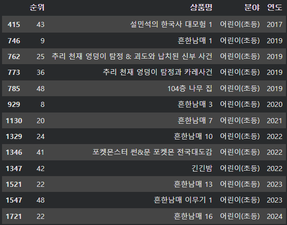 tmp = pd.read_excel(f'/content/drive/MyDrive/공모전/블로그/베스트셀러 데이터/교보문고_종합_베스트셀러_상품리스트 {year}.xlsx')