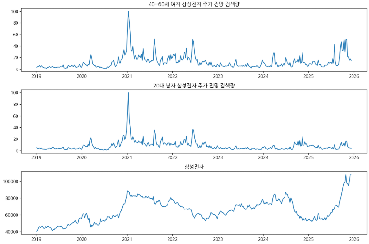 다음은 삼성전자 주가 전망 검색량과 삼성전자 주가 변동을 시각화했다. 2021년에 검색량이 급등한 이후로 주가가 점점 빠지기 시작했다. 2025년 말 검색량이 급증했을 때도 주가가 확 빠졌다. 검색량이 잠잠해지니까 다시 복구되는 모습을 보인다.