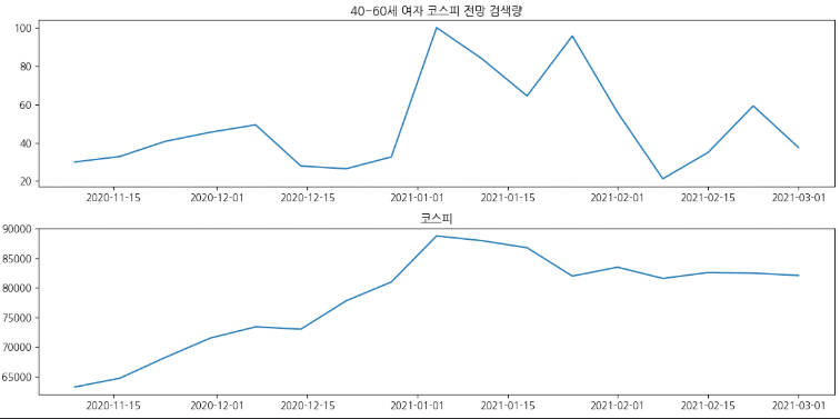 3. 40~60세 여성 검색량 데이터와 주가 데이터 비교